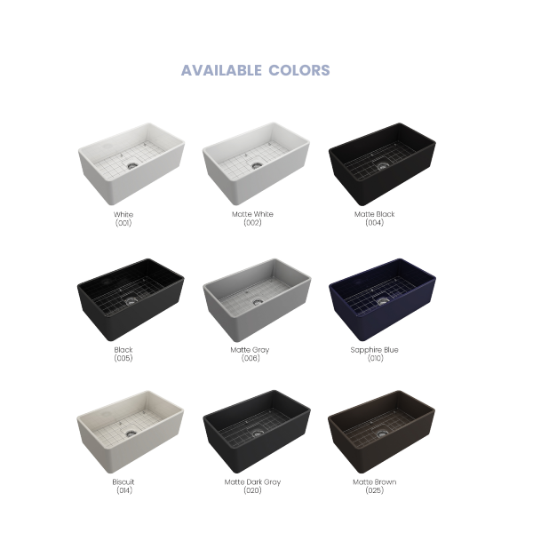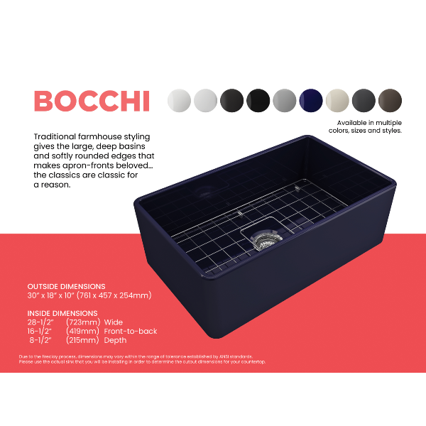 Bocchi Fireclay Farmhouse Sink 30" Classico Single Bowl W/ Grid Specification Sheet Click Here