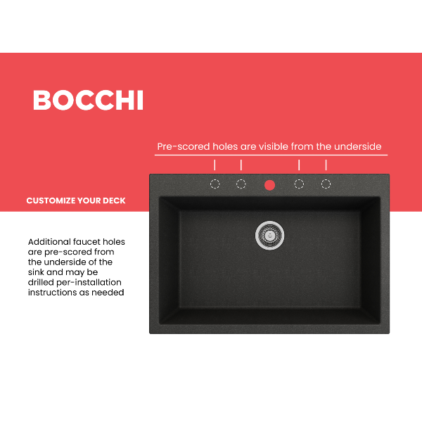- Single bowl with customizable faucet deck: fully drilled for a single hole faucet, with predrilled markings on the underside for up to 4 additional holes