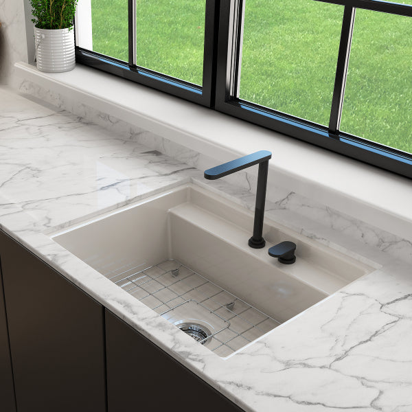 - Exclusive high-pressure casted, organic fine fireclay construction with workstation ledge and accessories