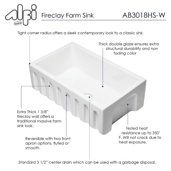 AB3018HS-W 30" White Reversible Single Bowl Fireclay Farmhouse Sink Specifications