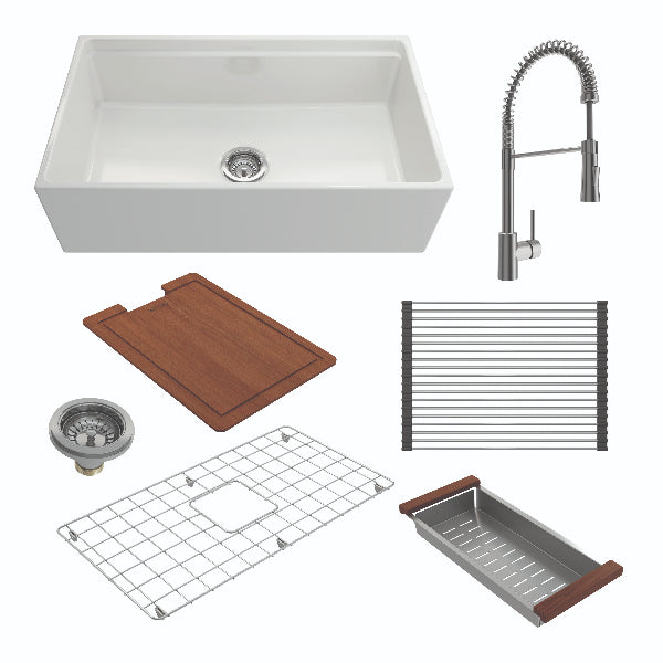 Contempo 33" White Single Bowl Fireclay Integrated Work Station Sink with Work Station Accessories & Livenza 2.0 Stainless Steel Faucet by BOCCHI