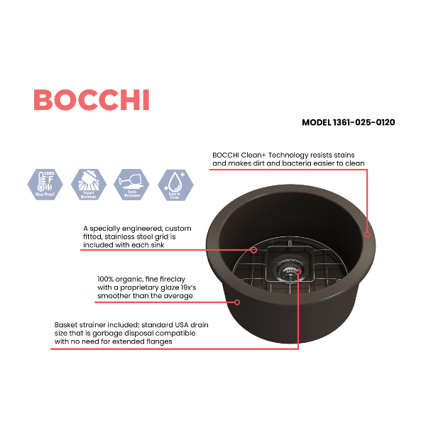 BOCCHI sinks bring back the ultimate material to your kitchen. Fireclay, a 100% natural, organic and recyclable material used by craftsman for centuries to create timeless appliances, has now returned to your kitchen. Fired in kilns at 2000°F, Fireclay becomes the most durable material used in today's kitchens. Thus, dealing with extreme heat coming from pots and pans is definitely not a problem. Additionally, our proprietary glaze is fused with the fireclay body so our sinks have a non-porous, uniform, scratch and stain resistant surface. With their protective bottom grid and distinctive looks, BOCCHI sinks are truly crafted to match your style and hold up to your busy life.