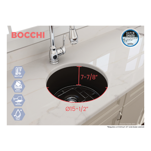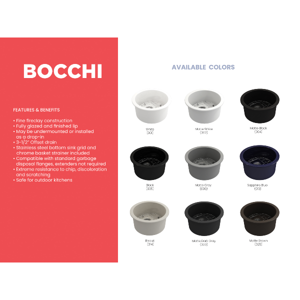 Bocchi Fireclay Undermount 18" Round Single Bowl Prep Sink Sotto Specification Sheet Click Here