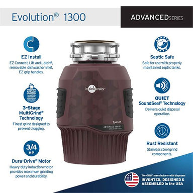 Evolution 1300, 3/4 HP Garbage Disposal, Advanced Series EZ Connect by InSinkErator The InSinkErator Evolution 1300, 3/4 HP Garbage Disposal, o...