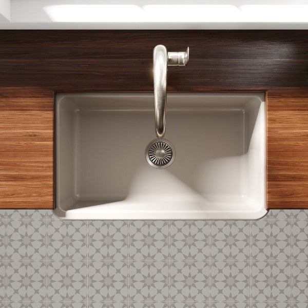 Fireclay is also extremely durable. Fired at very high temperatures - often over 2000 degrees, the clear glaze permanently fuzes to the fireclay material. The results are a glossy, easy-to-wipe-clean surface that is extremely stained, scratch, acid, alkali, and impact resistant.