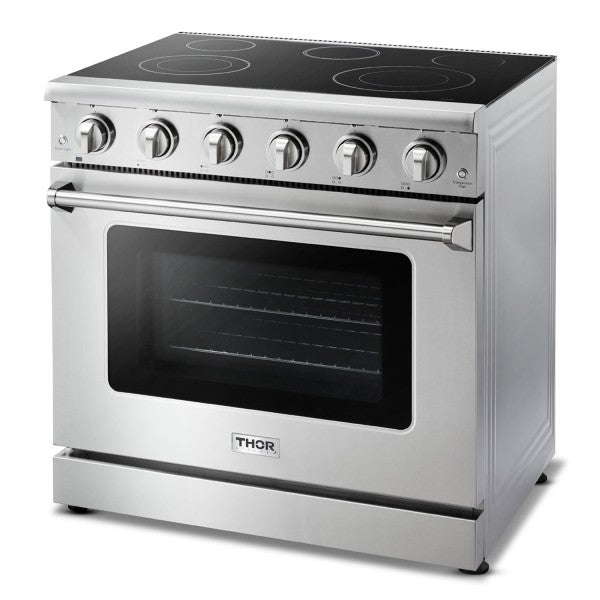 The THOR Kitchen 36 Inch Professional Electric Range is a stainless-steel machine that is designed with powerful features and functionality. This range features a smooth glass top that is easy to clean and five heating element zones that give you the ultimate cooking flexibility. From a 100W warming zone to a high-powered 3,000W LightningBoil™ Element, this range gives you the power to master any meal.