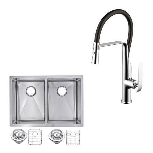 CF511-UD-2920B 29" Double Bowl Stainless Steel Undermount Sink with Drains, Strainers, Bottom Grids, And Single Hole Faucet by Water Creation