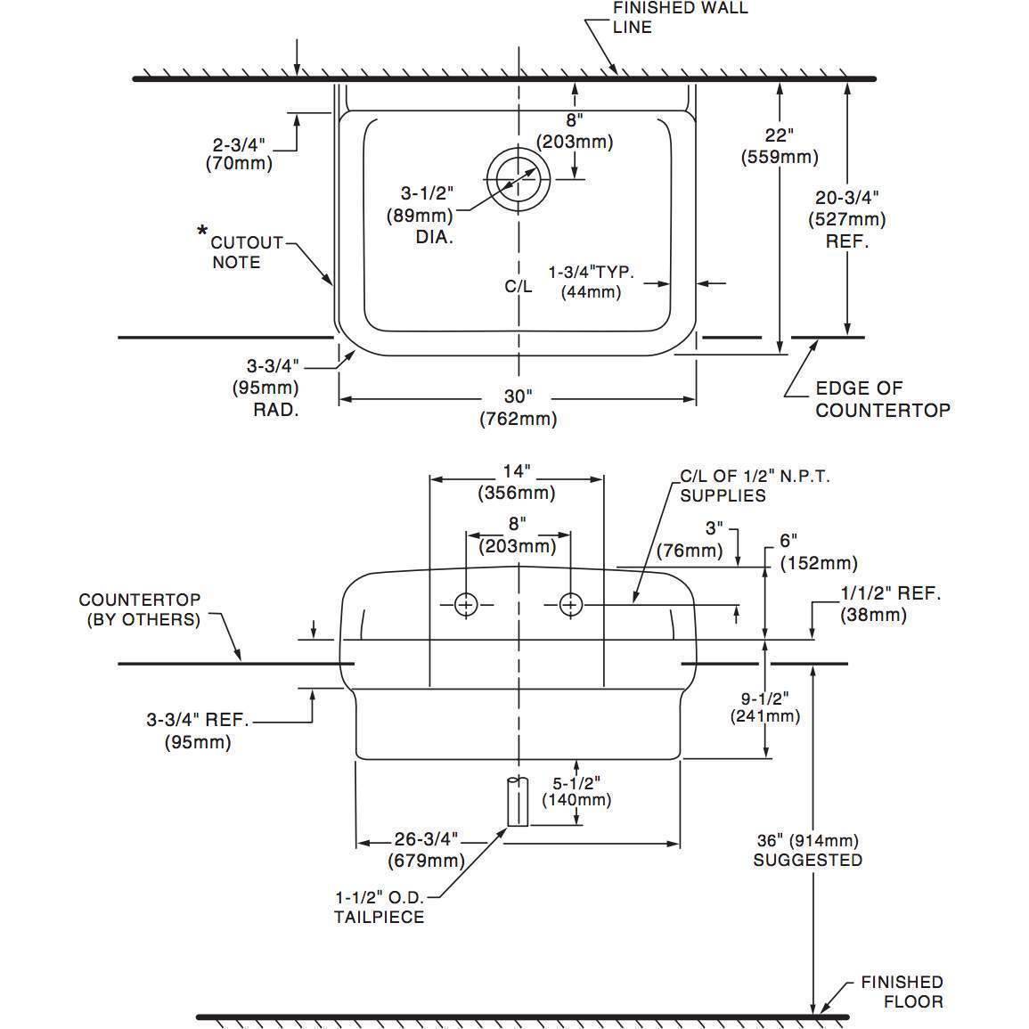 - Faucet holes on 8" centers for wall mounted sink faucet
