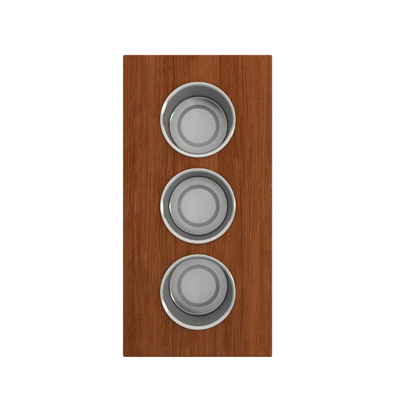Sapele Wood Board with 3 round Stainless Steel Bowls for food prep, entertaining, and serving appetizers.