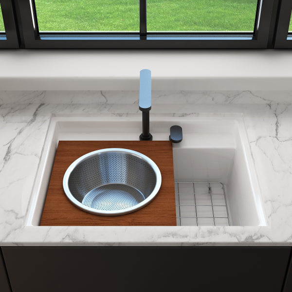 Sapele Wood Board with a large mixing bowl and large colander.