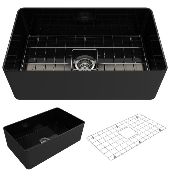 Aderci 30" Black Single Bowl Ultra-Slim Fireclay Farmhouse Sink with Protective Bottom Grid and Strainer by BOCCHI