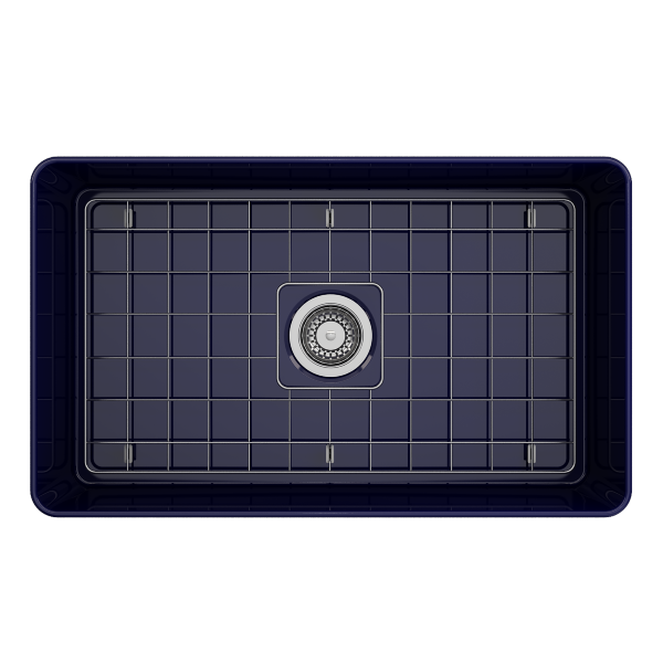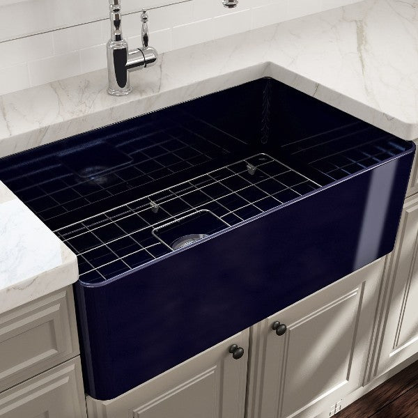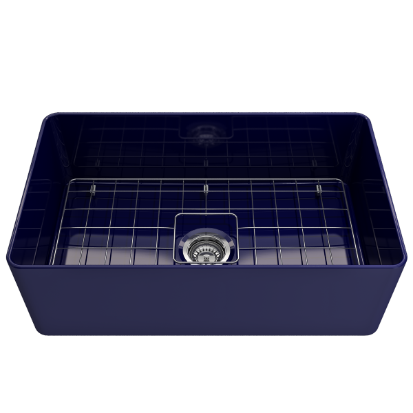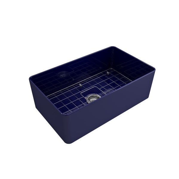 Aderci 30" Sapphire Blue Single Bowl Ultra-Slim Fireclay Farmhouse Sink with Protective Bottom Grid and Strainer by BOCCHI
