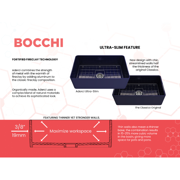 BOCCHI’s Aderci gives a timeless classic, the apron-front farmhouse kitchen sink,  a modern and ultra-chic new look! Organically made, Aderci uses a new, complex blend of natural materials, including aluminum, to add the strength of metal to the warmth of fireclay. This allows wall thickness to be cut nearly in half—resulting in 15-20% more cubic volume in the basin. Aderci is strength and elegance at its very best.