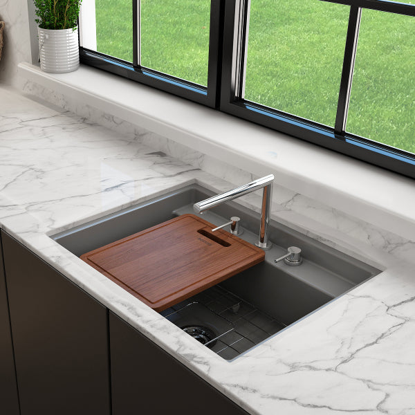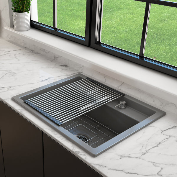 BOCCHI Baveno Uno 27" Matte Gray Fireclay Single Bowl Dual-Mount Sink with Integrated Workstation