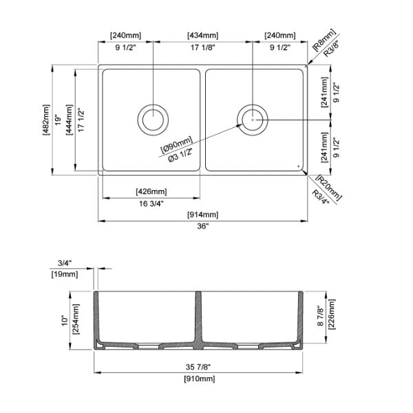 Bocchi 36" Fireclay Farmhouse Sink Double Bowl Vigneto w/ Grid Technical Sheet Click Here