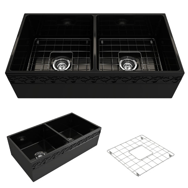 Bocchi Vigneto 36" Black Fireclay Double Bowl Farmhouse Sink w/ Grid