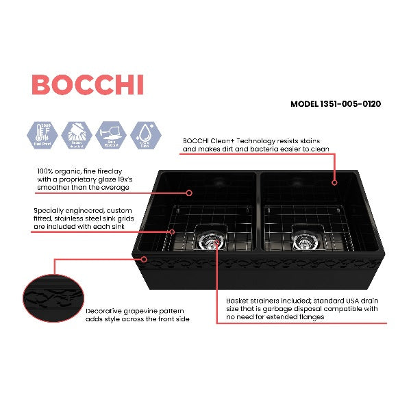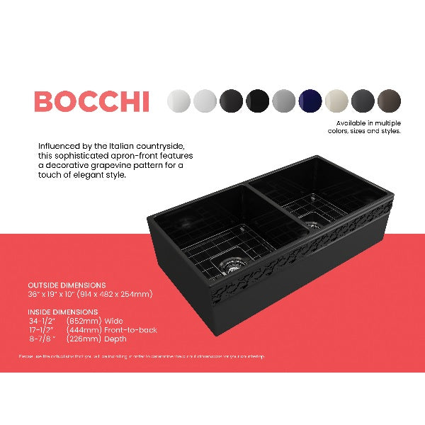 Bocchi 36" Fireclay Farmhouse Sink Double Bowl Vigneto w/ Grid Specification Sheet Click Here