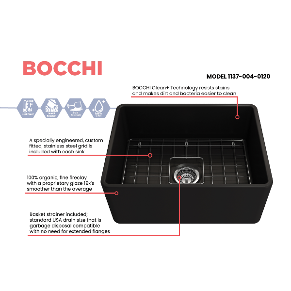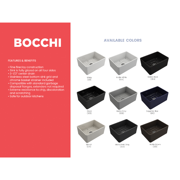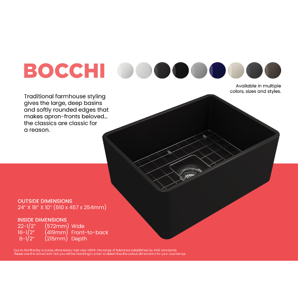 Bocchi Fireclay Farmhouse Sink 24" Single Bowl Classico w/ Grid Specification Sheet Click Here