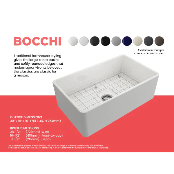 Bocchi Fireclay Farmhouse Sink 30" Classico Single Bowl W/ Grid Specification Sheet Click Here