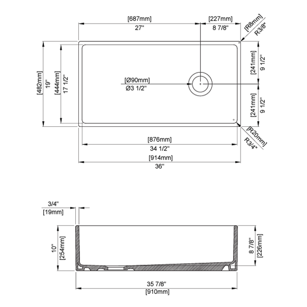 Bocchi 36" Fireclay Farmhouse Sink Single Bowl Contempo w/ Grid Technical Sheet Click Here