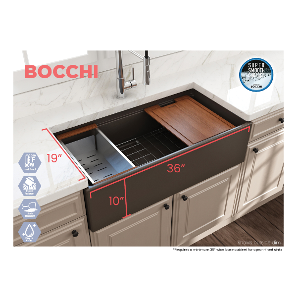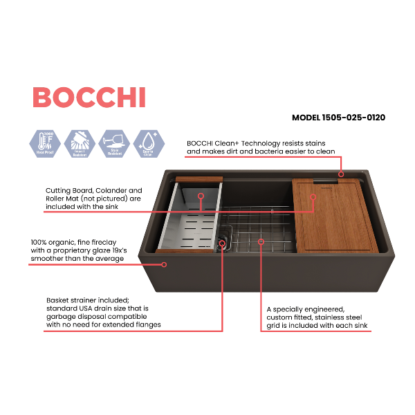 BOCCHI sinks bring back the ultimate material to your kitchen. Fireclay, a 100% natural, organic and recyclable material used by craftsman for centuries to create timeless appliances, has now returned to your kitchen. Fired in kilns at 2000°F, Fireclay becomes the most durable material used in today's kitchens. Thus, dealing with extreme heat coming from pots and pans is definitely not a problem. Additionally, our proprietary glaze is fused with the fireclay body so our sinks have a non-porous, uniform, scratch and stain resistant surface. With their protective bottom grid and distinctive looks, BOCCHI sinks are truly crafted to match your style and hold up to your busy life.