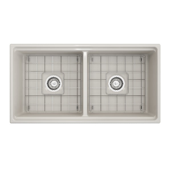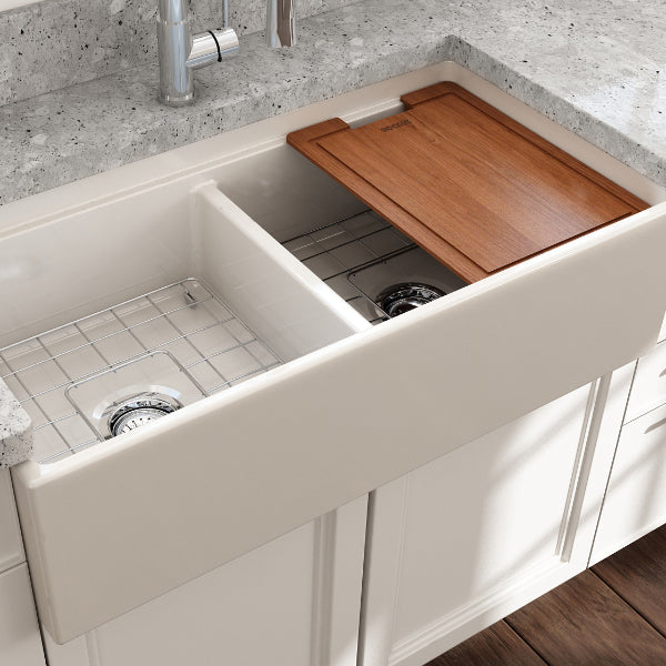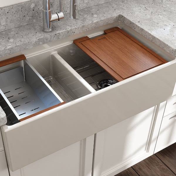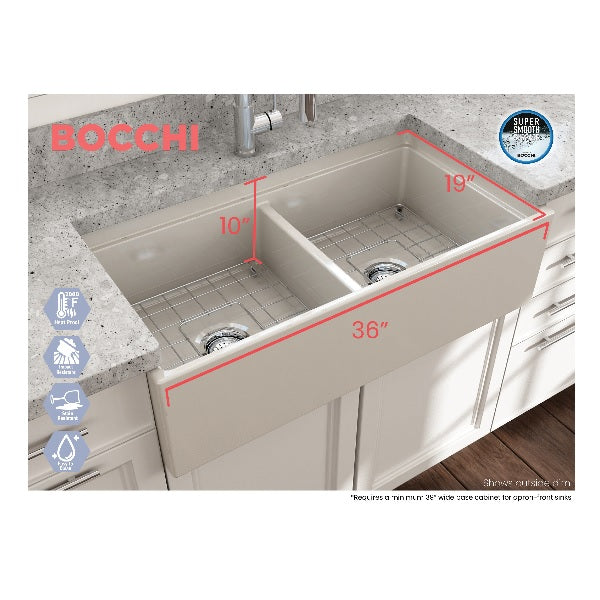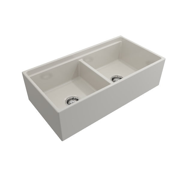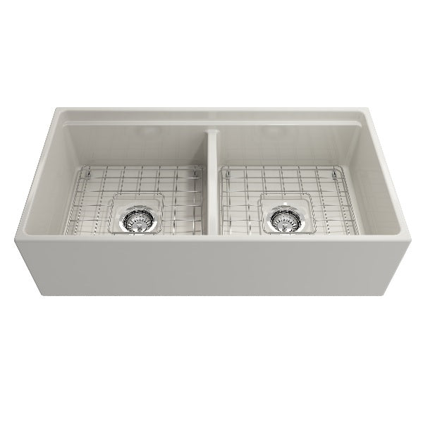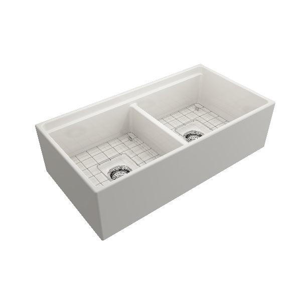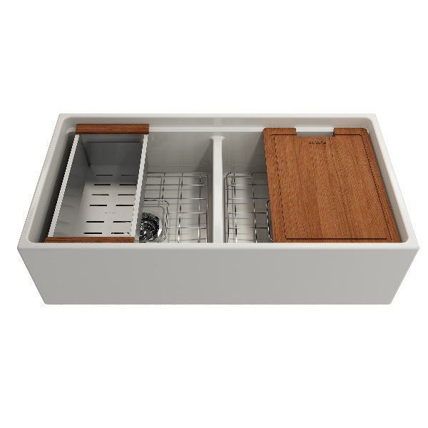 Contempo 36D Biscuit Double Bowl Fireclay Farmhouse Sink w/ Integrated Work Station & Accessories by BOCCHI