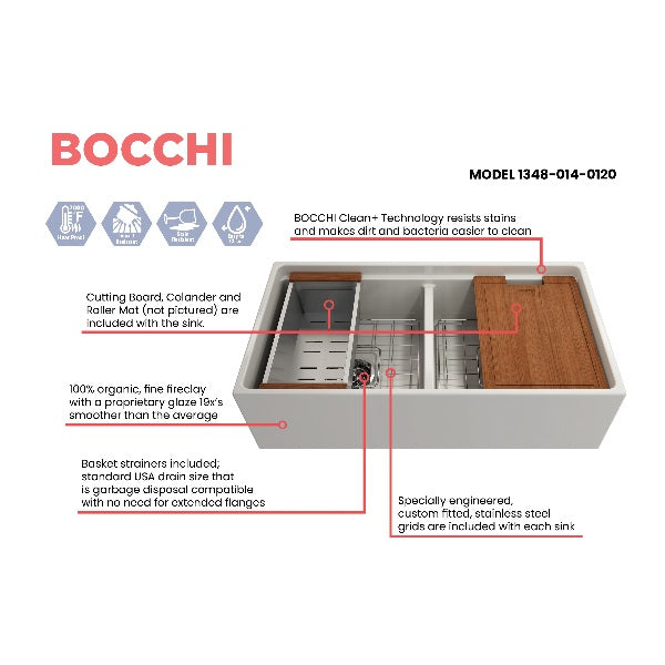Bocchi Contempo 36D Double Bowl Fireclay Farmhouse Sink w/ Step Rim Technical Specifications