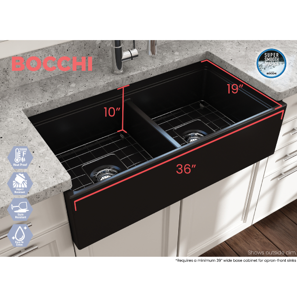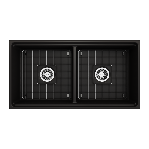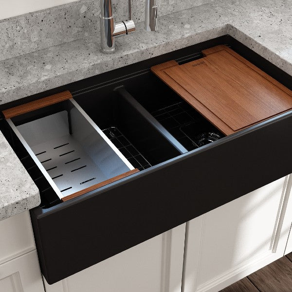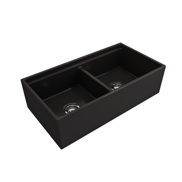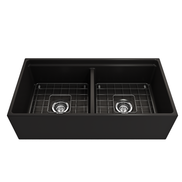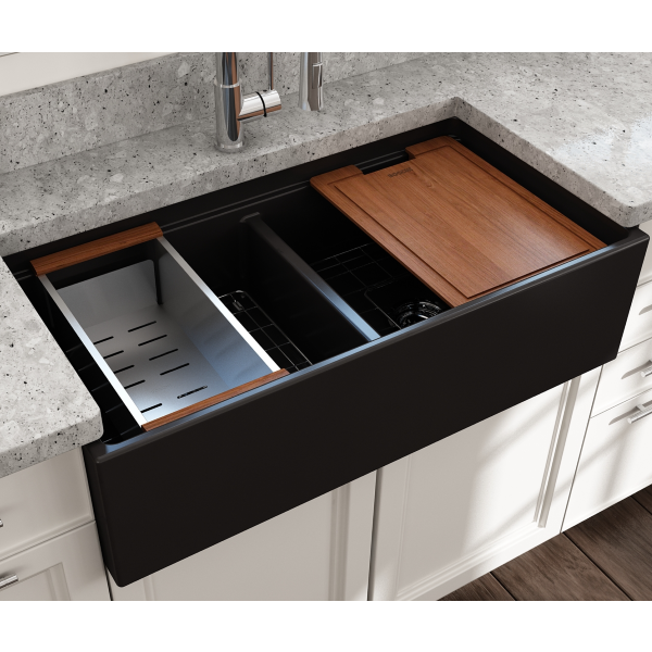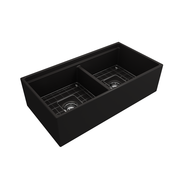 Contempo 36D Matte Black Double Bowl Fireclay Farmhouse Sink w/ Integrated Work Station & Accessories by BOCCHI