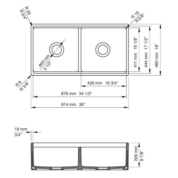 Bocchi Contempo 36D White Double Bowl Fireclay Farmhouse Sink w/ Step Rim Technical Specifications