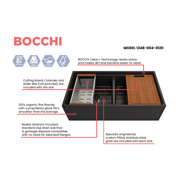 BOCCHI sinks bring back the ultimate material to your kitchen. Fireclay, a 100% natural, organic and recyclable material used by craftsman for centuries to create timeless appliances, has now returned to your kitchen. Fired in kilns at 2000°F, Fireclay becomes the most durable material used in today's kitchens. Thus, dealing with extreme heat coming from pots and pans is definitely not a problem. Additionally, our proprietary glaze is fused with the fireclay body so our sinks have a non-porous, uniform, scratch and stain resistant surface. With their protective bottom grid and distinctive looks, BOCCHI sinks are truly crafted to match your style and hold up to your busy life.