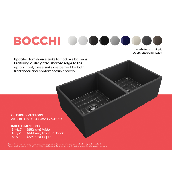 Bocchi 36" Fireclay Farmhouse Sink Double Bowl Contempo w/ Grid  Specification Sheet Click Here