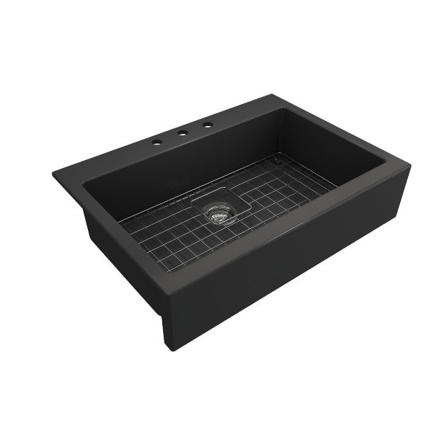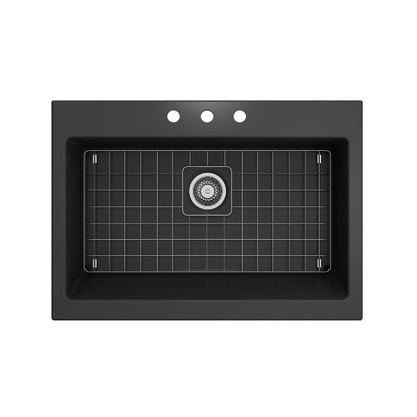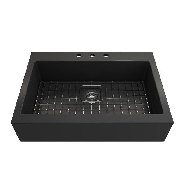 Nuova 34" Matte Dark Gray Single Bowl Fireclay Drop-In Sink w/ Grid and Strainer by Bocchi