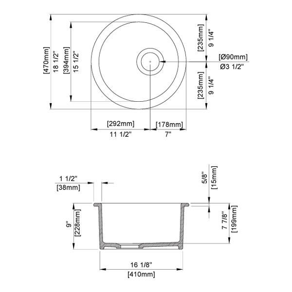 Bocchi Fireclay Undermount 18" Round Single Bowl Prep Sink Sotto Technical Drawing Click Here