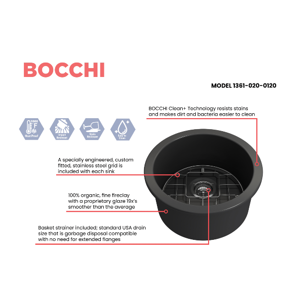 BOCCHI sinks bring back the ultimate material to your kitchen. Fireclay, a 100% natural, organic and recyclable material used by craftsman for centuries to create timeless appliances, has now returned to your kitchen. Fired in kilns at 2000°F, Fireclay becomes the most durable material used in today's kitchens. Thus, dealing with extreme heat coming from pots and pans is definitely not a problem. Additionally, our proprietary glaze is fused with the fireclay body so our sinks have a non-porous, uniform, scratch and stain resistant surface. With their protective bottom grid and distinctive looks, BOCCHI sinks are truly crafted to match your style and hold up to your busy life.