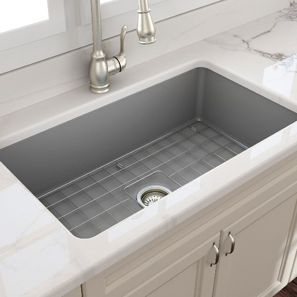 Sotto 32 Matte Gray Fireclay Single Bowl Undermount Kitchen Sink with FREE Bottom Grid and Strainer by BOCCHI