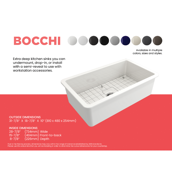 Bocchi Fireclay 32" Undermount Single Bowl Sotto Sink W/ Grid Specification Sheet Click Here