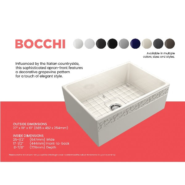 Bocchi Fireclay Farmhouse Sink 27" Single Bowl Vigneto W/ Grid Technical Sheet Click Here