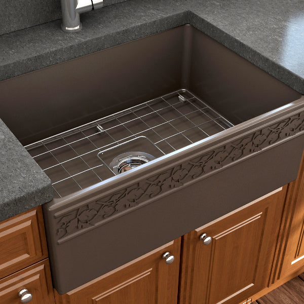 Bocchi Vigneto 27" Brown Fireclay Single Bowl Farmhouse Sink w/ Grid