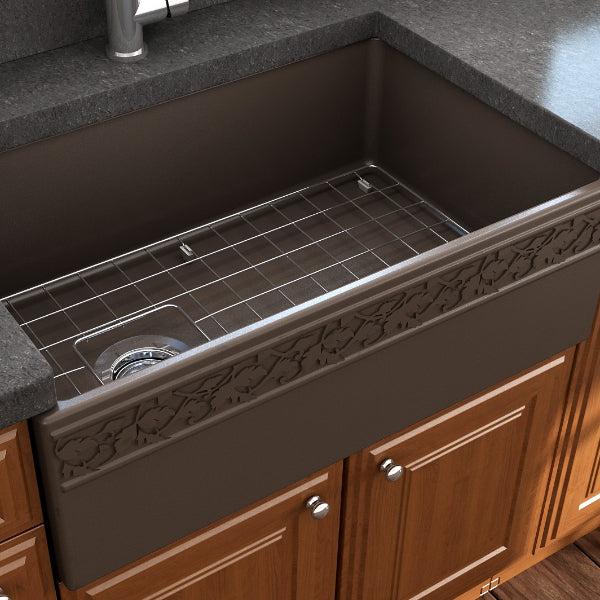 Bocchi Vigneto 30" Brown Fireclay Single Bowl Farmhouse Sink W/ Grid