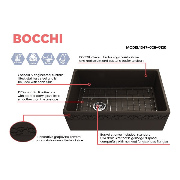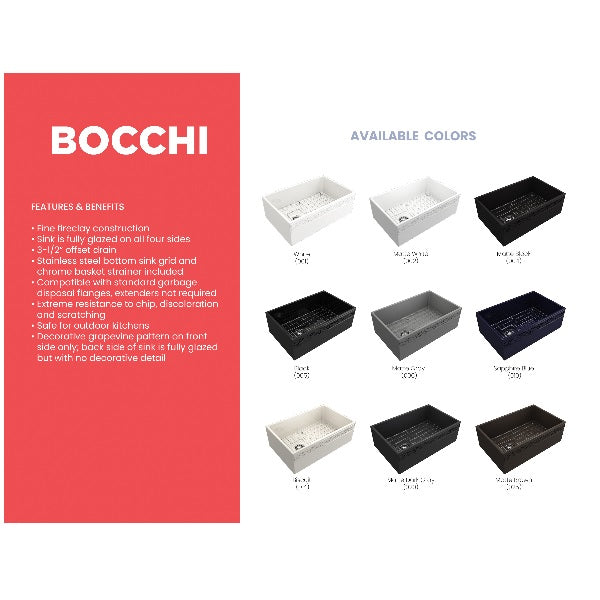 Bocchi Fireclay Farmhouse Sink 30" Single Bowl Vigneto W/ Grid Technical Sheet Click Here