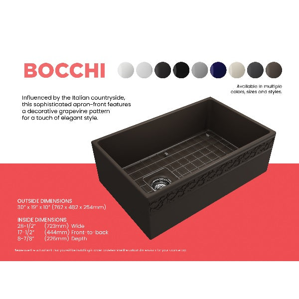 Bocchi Fireclay Farmhouse Sink 30" Single Bowl Vigneto W/ Grid Specification Sheet Click Here