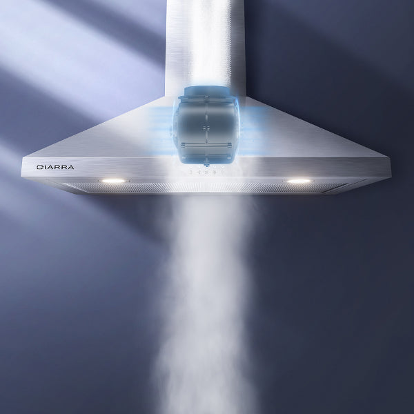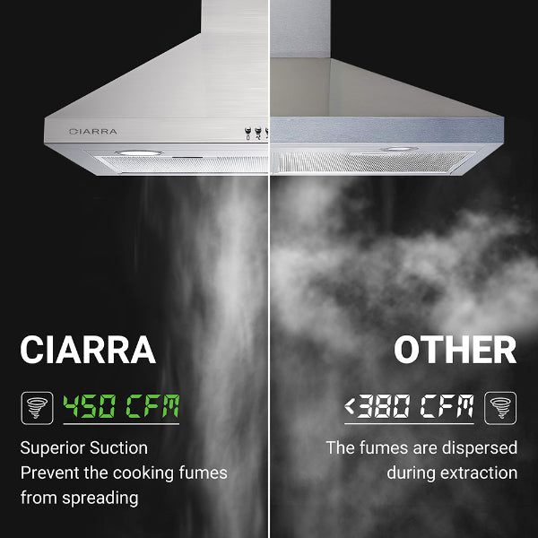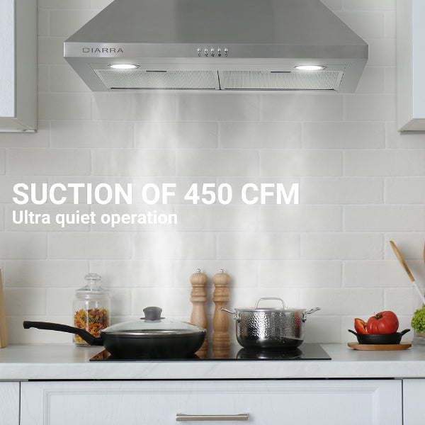 The CIARRA Wall Mount Convertible Range Hood sports a durable motor system that neutralizes odors with ease. This 30-inch range hood features 3-speed levels to suit your ventilation needs. With a powerful 450 CFM suction power and 5-layer aluminum mesh filters, this vent hood can remove smoke and cooking odors with ease, thereby keeping your cooking area safe and clean.
