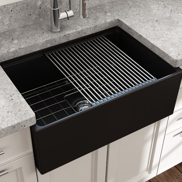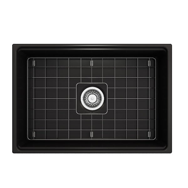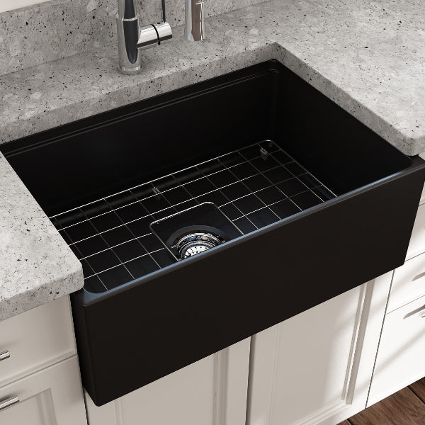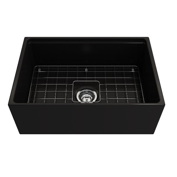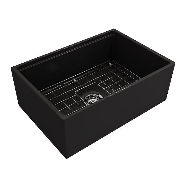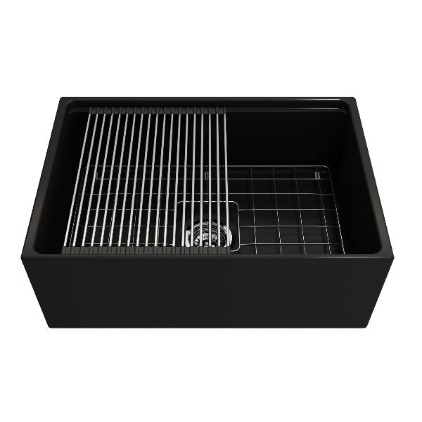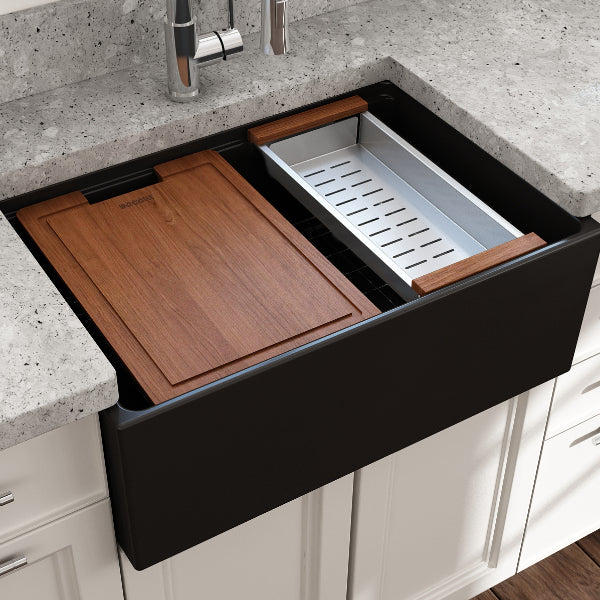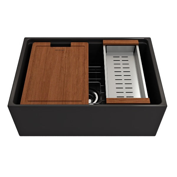 Contempo 27" Matte Black Single Bowl Step-Rim Fireclay Farmhouse Sink with Integrated Work Station & Accessories by BOCCHI