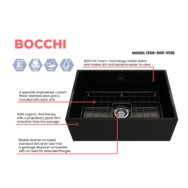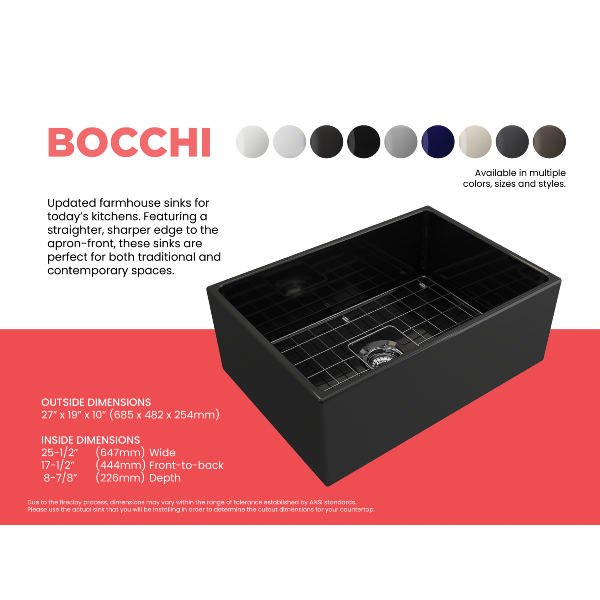 Bocchi Fireclay Farmhouse Sink 27" Single Bowl Contempo w/ Grid Specification Sheet Click Here