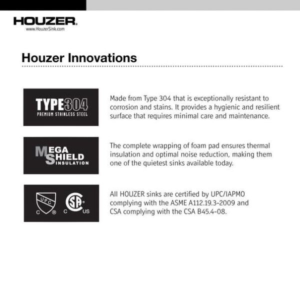 This model is fabricated with 18-gauge T304 stainless steel and each bowl measures 15-inches by 16-inches by 10-inches deep. Includes mounting clips and a template for added convenience. Meets ASME A112.19.3-2000, UPC, and CSA standards and covered by a limited lifetime warranty. Fits 36-inch cabinet