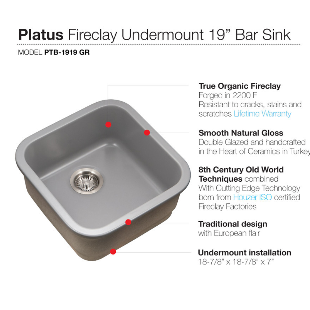 Houzer PTB-1919 Grace the heart of your home with the timeless classic of a Houzer fireclay bar sink that is fired for over 20 hours at 2200° F. The surface is impervious to stains, scratches, and chips, backed by the confidence of Houzer’s Limited Lifetime Warranty. Houzer combines the latest in cutting-edge technology using the most advanced injection molding techniques along with old-world hand craftsmanship. Our fireclay sinks are crafted with 70 years of experience in our own Houzer ISO-certified factories in Turkey.