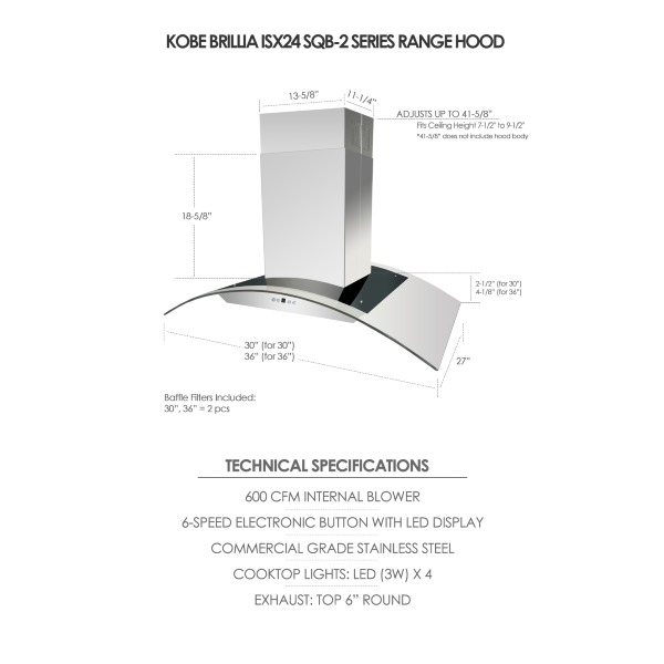 KOBE Brillia island range hood is equipped with 6-speed electronic control with LED display, dishwasher-safe baffle filters, LED lights with a 4-level setting, and delay shutoff. The internal blower can run at a maximum of 600 CFM or run quietly at 2.0 sone on QuietMode.