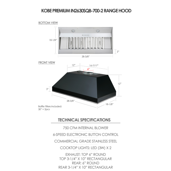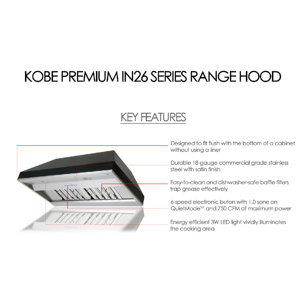 KOBE Premium 30-inch built-in/ insert range hood seamlessly fits with custom cabinetry without the need for a liner.  High performance with 750 CFM internal blower and operates very quietly.  The range hood comes with stainless steel baffle filters, versatile multi-exhaust options for both top and rear venting, LED lights with 3-level lighting, electronic button control, and ECO Mode.  Wireless Remote Control is sold separately.