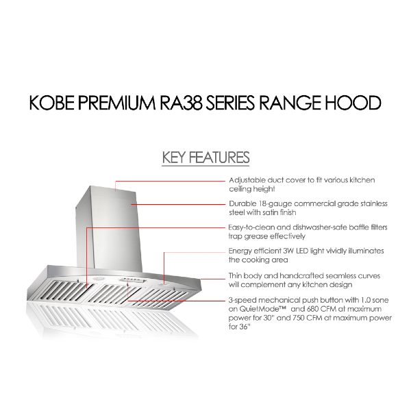 KOBE RA38 SQB-1 30" Stainless Steel 680 CFM Wall Mount Range Hood