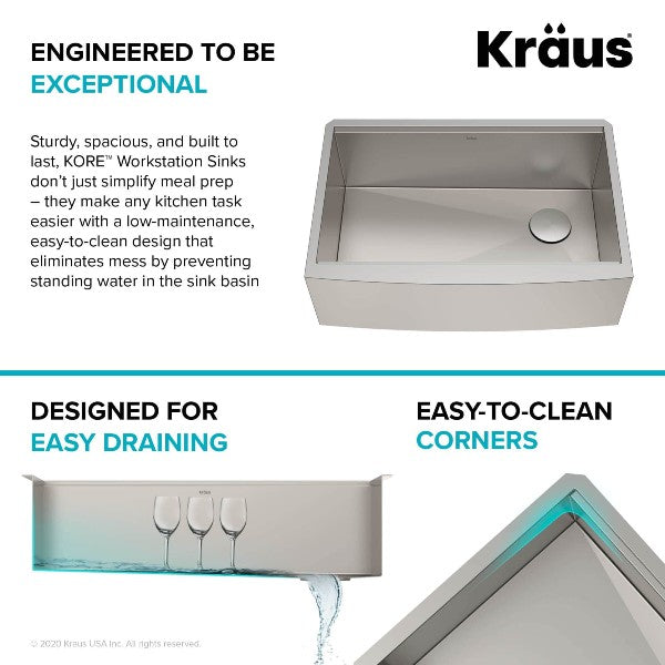 Do more with Kore™ – The ultimate sink for the modern home chef. Inspired by professional kitchens, the Kore™ Workstation Series instantly transforms your kitchen sink into a full-service prep station. Featuring a traditionally-inspired curved apron front, this deep-capacity farmhouse sink combines practical convenience with charming country style.